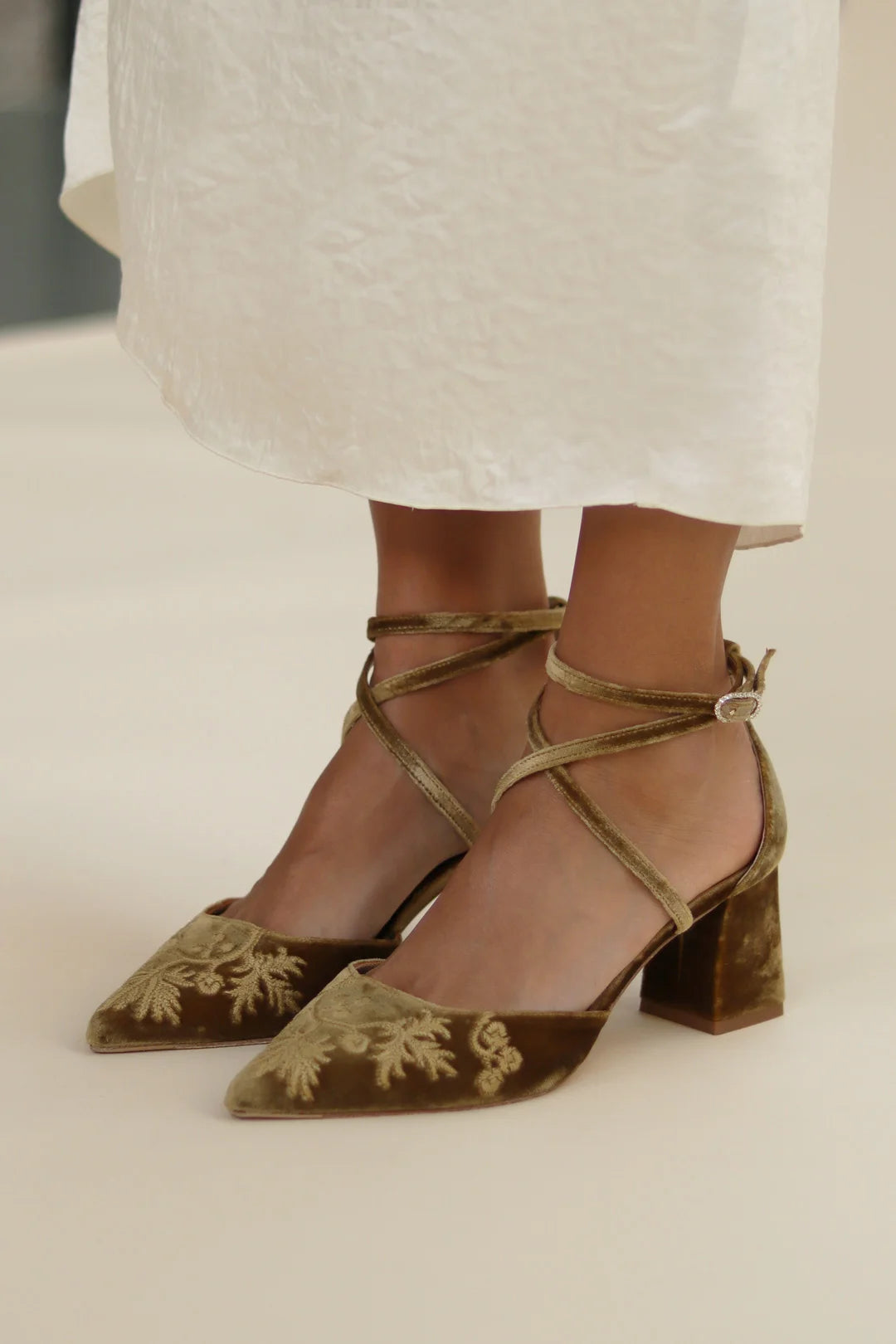 Zapatos de tacón en terciopelo color ámbar, con bordado floral en la punta y tacón bloque. Este nuevo modelo tan especial combina a la perfección comodidad, elegancia y artesanía. Un diseño ideal para novias o invitadas de otoño e invierno. Inspirados en los bordados que se impulsaron en la corte Española a finales del siglo XV.