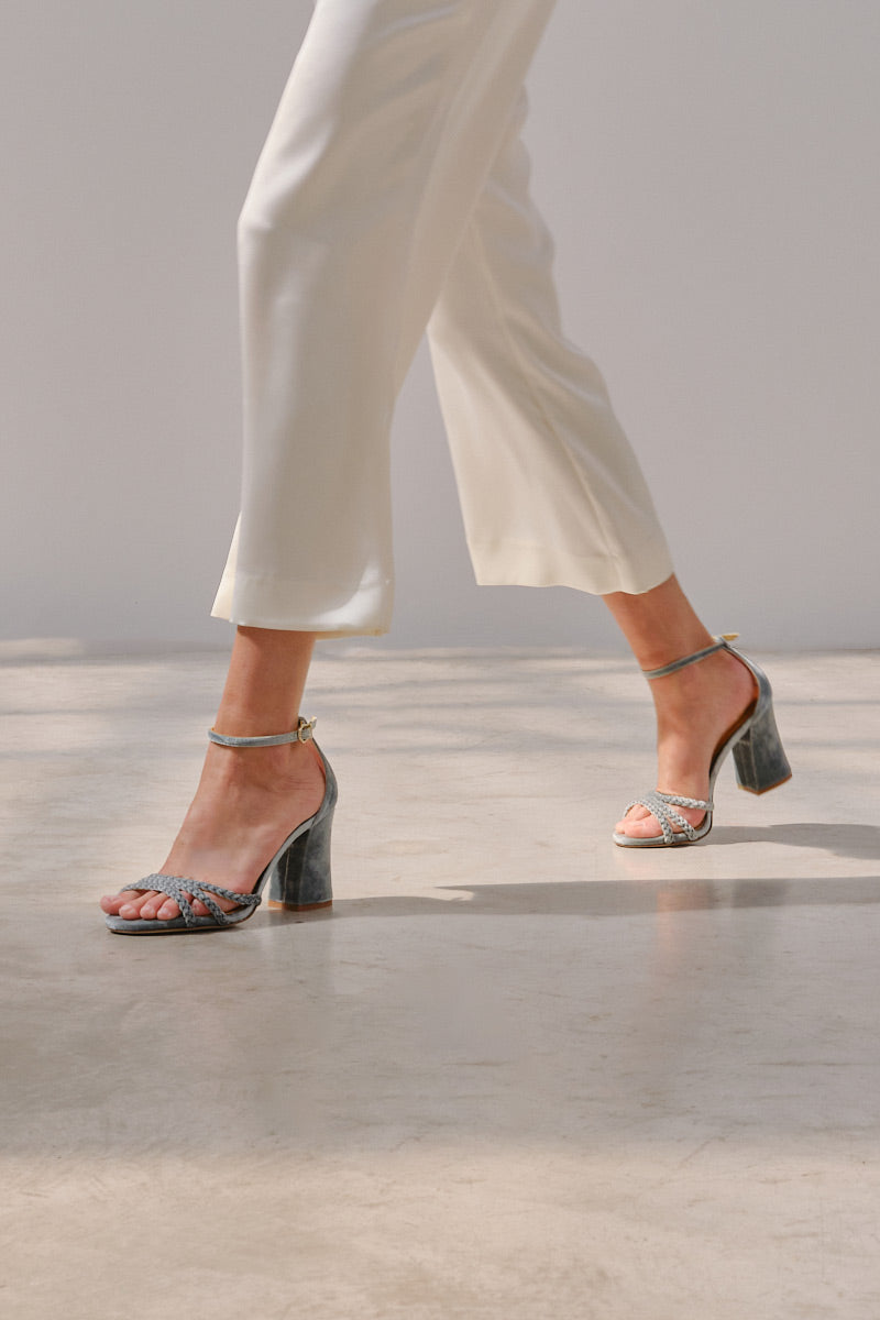 Sandales à lanières tressées bleues en velours de soie et talon confortable de 9 cm.