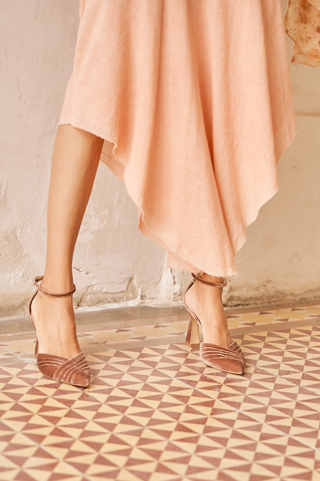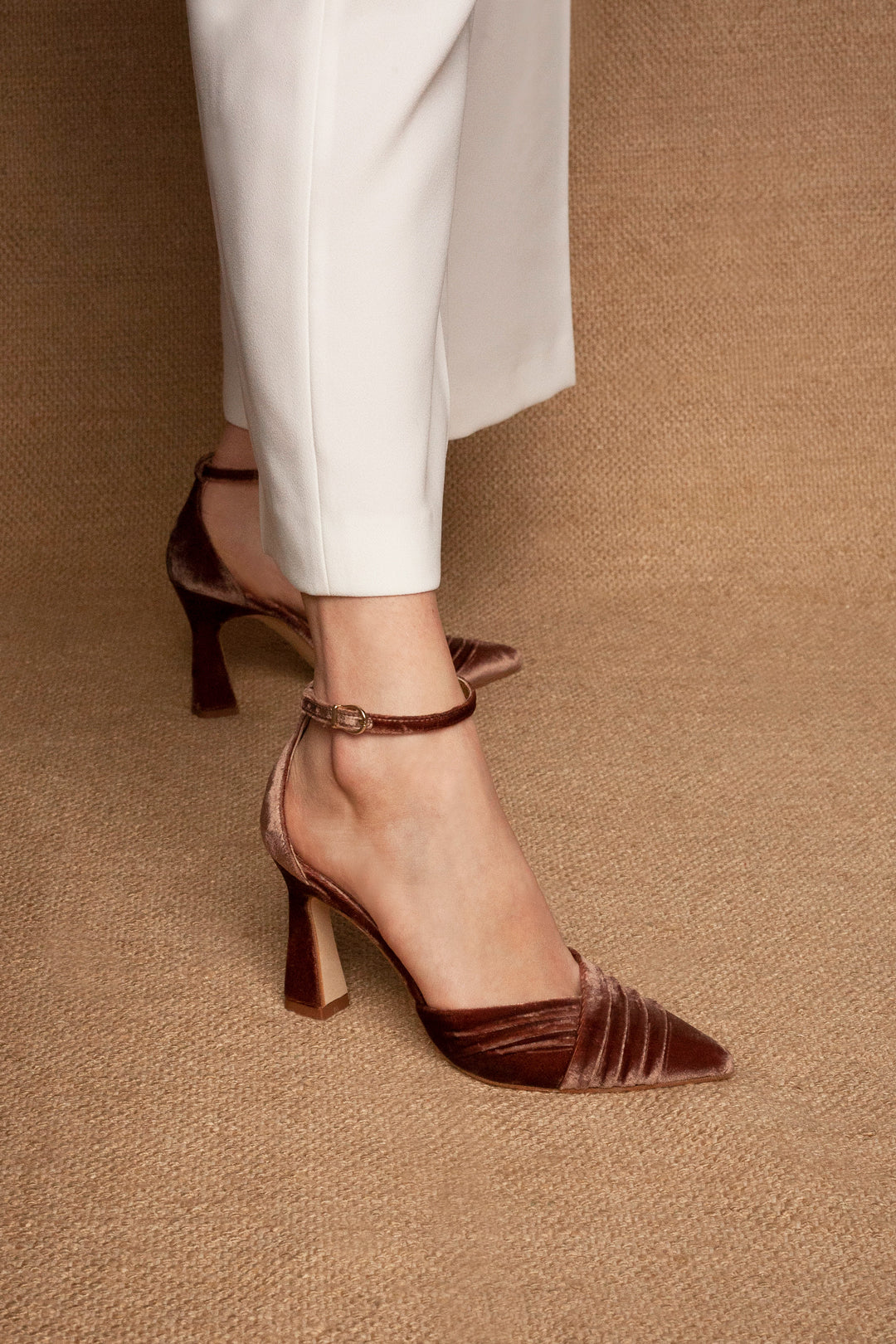 Closed shoe in garnet velvet, a deep and sophisticated burgundy shade. Featuring a 9 cm block heel and ankle strap, it combines elegance, support, and comfort.
