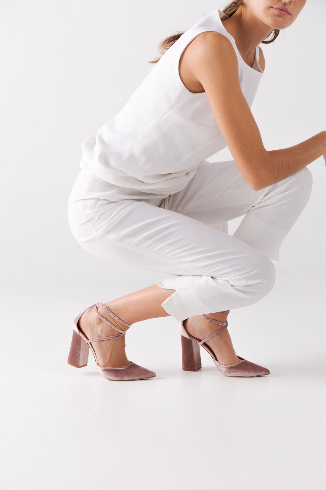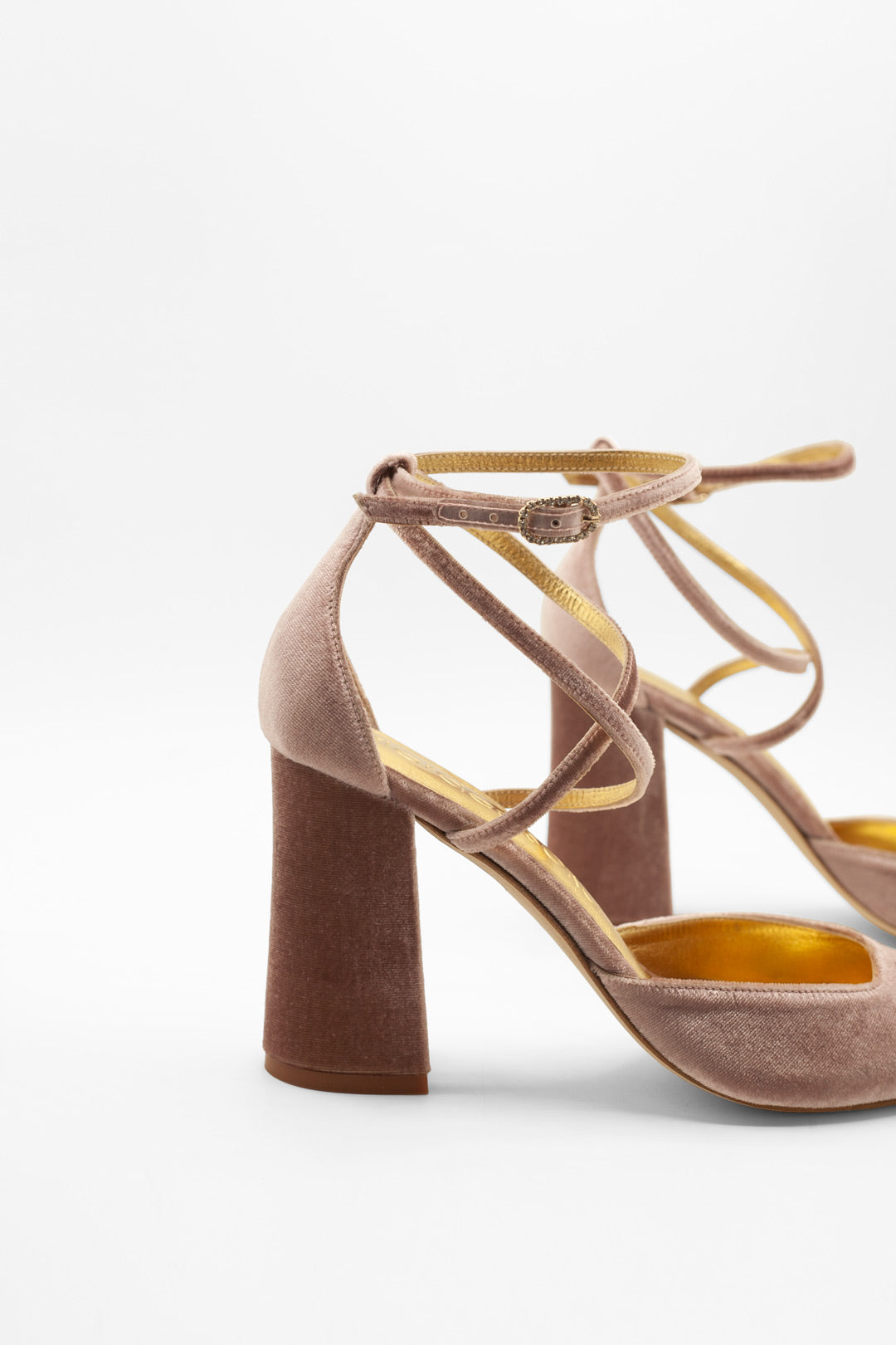 Pointed dusty pink velvet shoes with straps and a 9 cm heel.