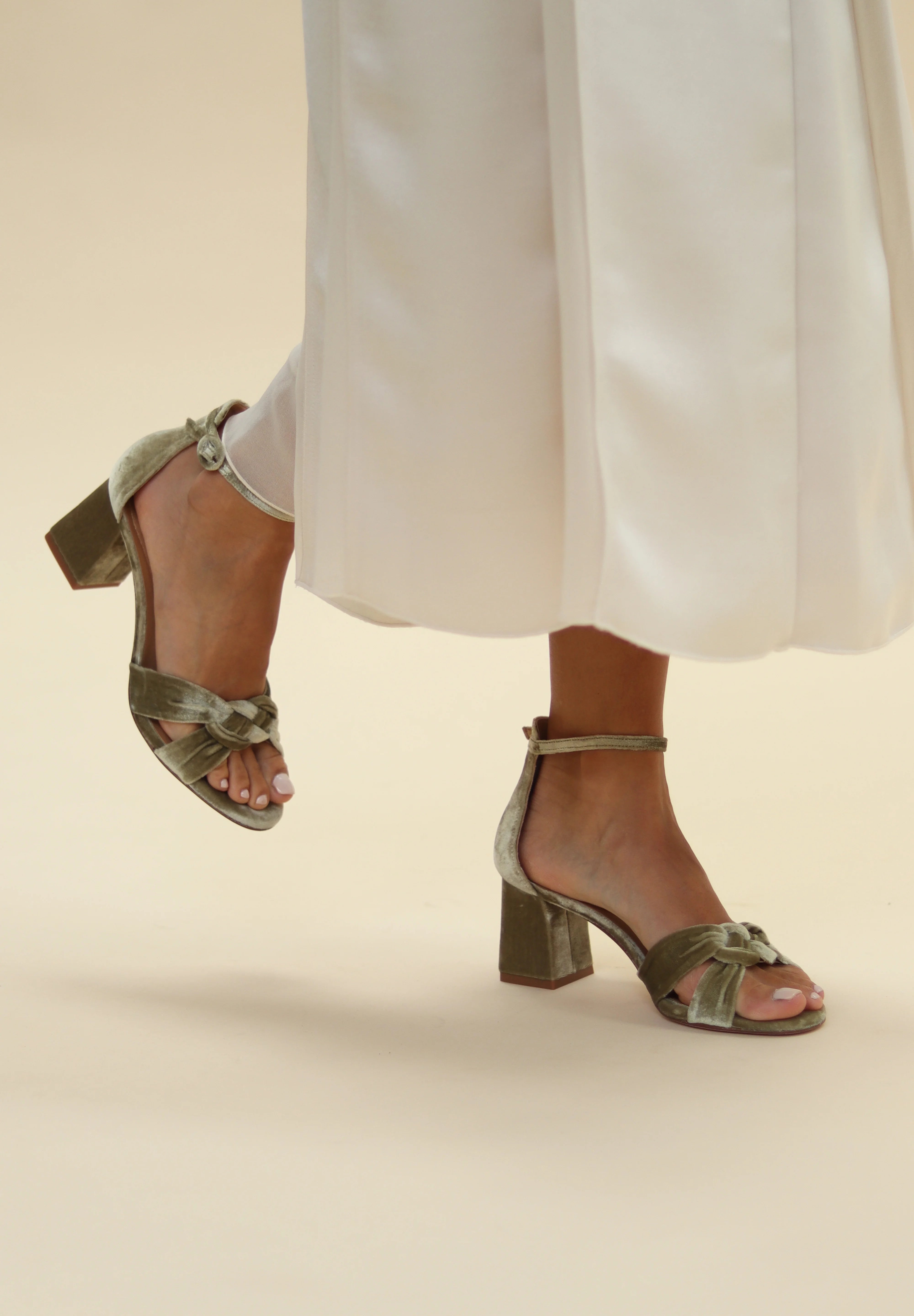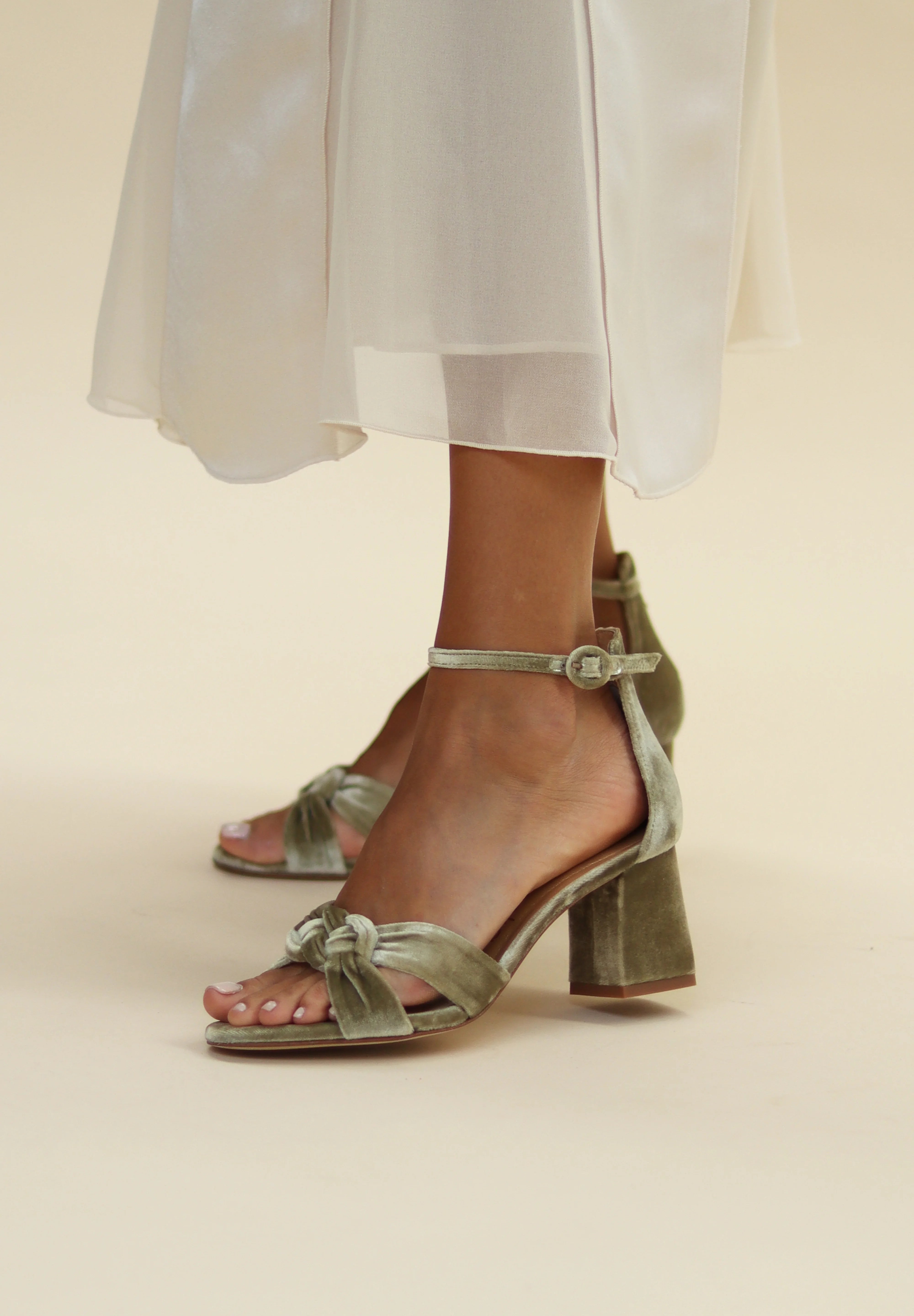 Sandalia con nudo en terciopelo verde. Su diseño envolvente y estructurado la convierten en una opción elegante y con presencia, perfecta para novias o invitadas que buscan el toque perfecto de color.