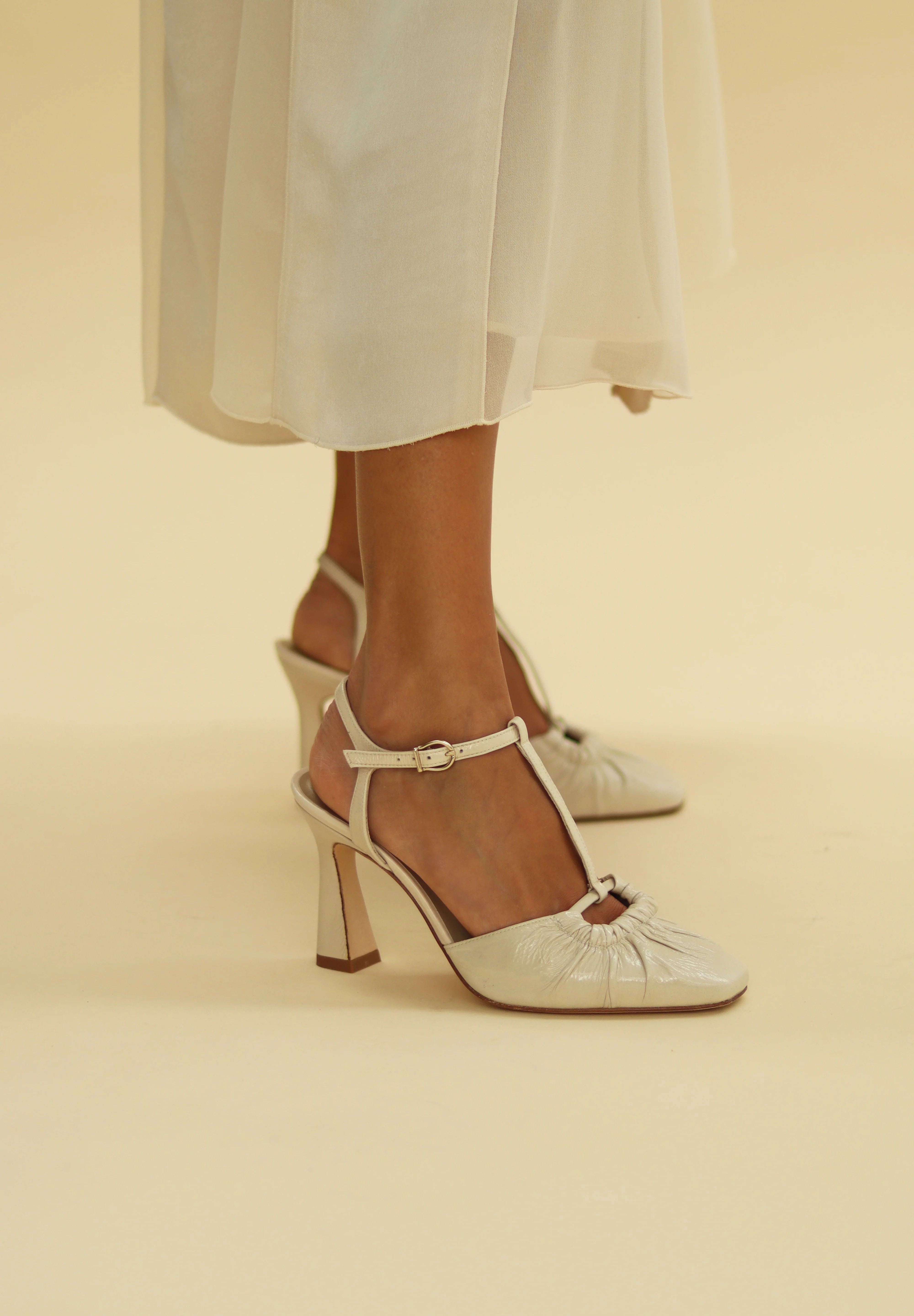 Zapato cerrado en piel charol en color crema, con T-bar y hebilla cuadrada en la pala estilo vintage diseñado para novia e invitada.