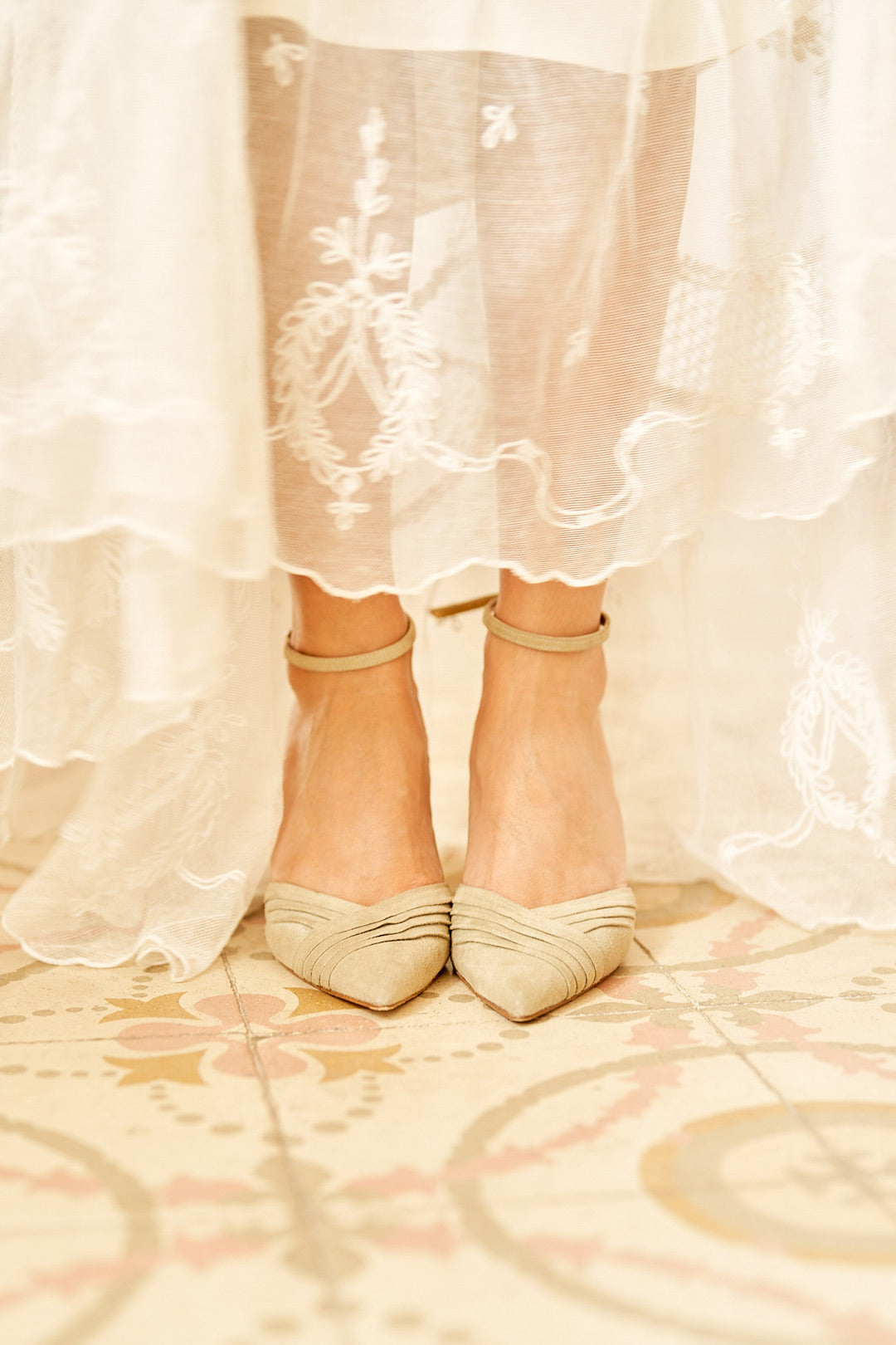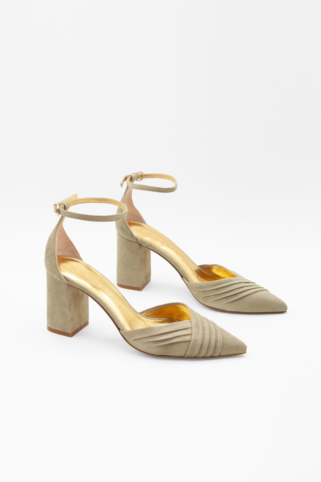Zapatos de novia tendencia para bodas 2025 de color verde grisáceo en ante con tacón bloque muy cómodos para la fiesta del evento