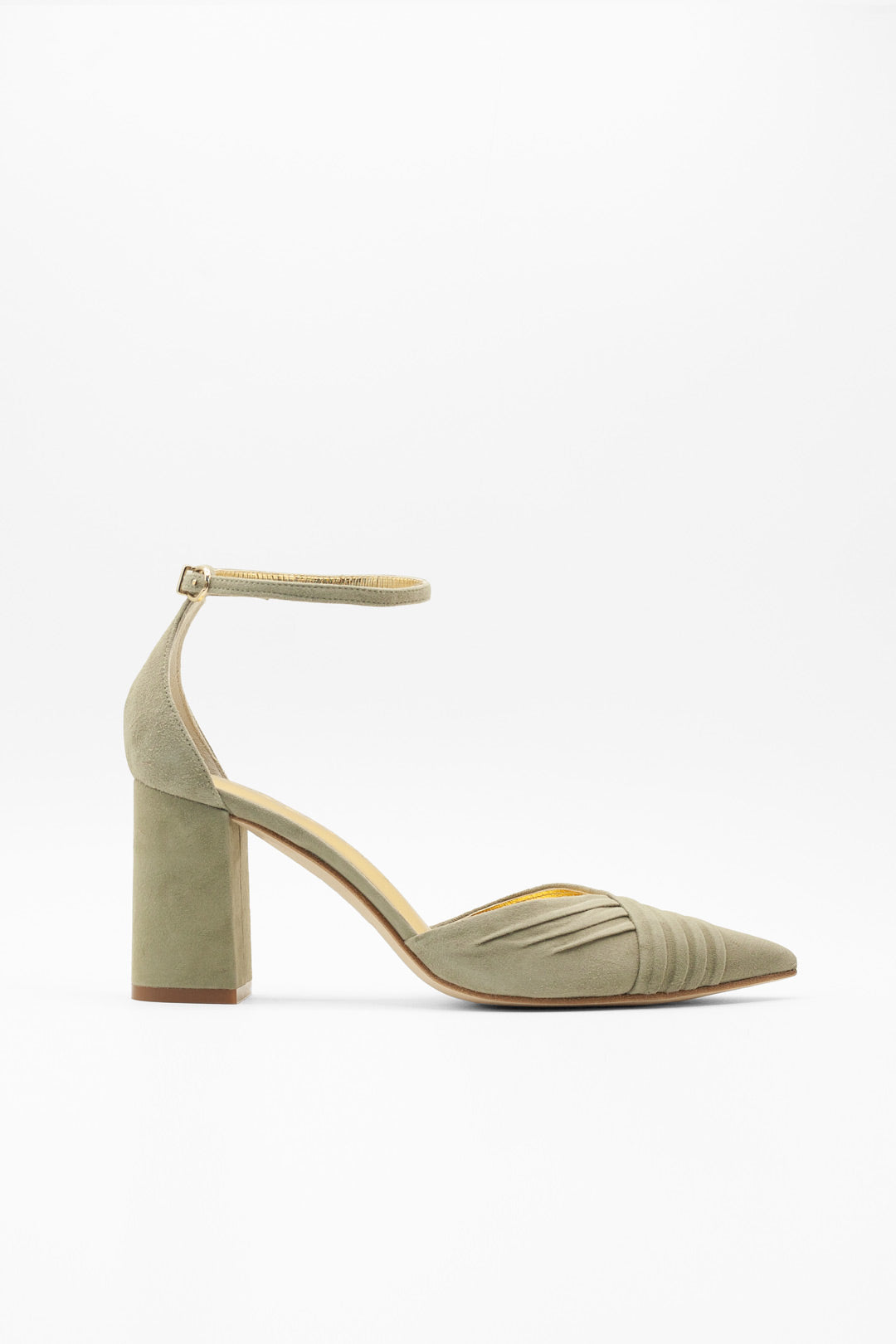 Zapato cerrado en punta en ante en color nilo, un verde sereno y sofisticado que aporta frescura y elegancia.