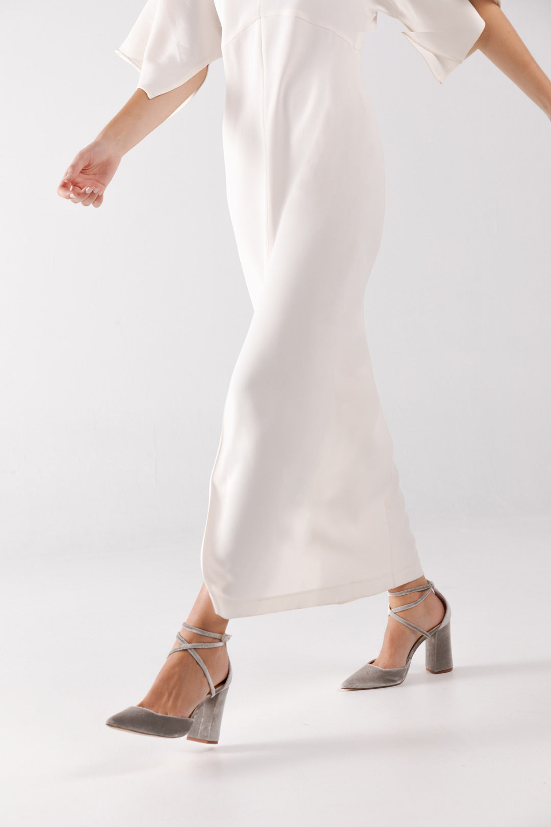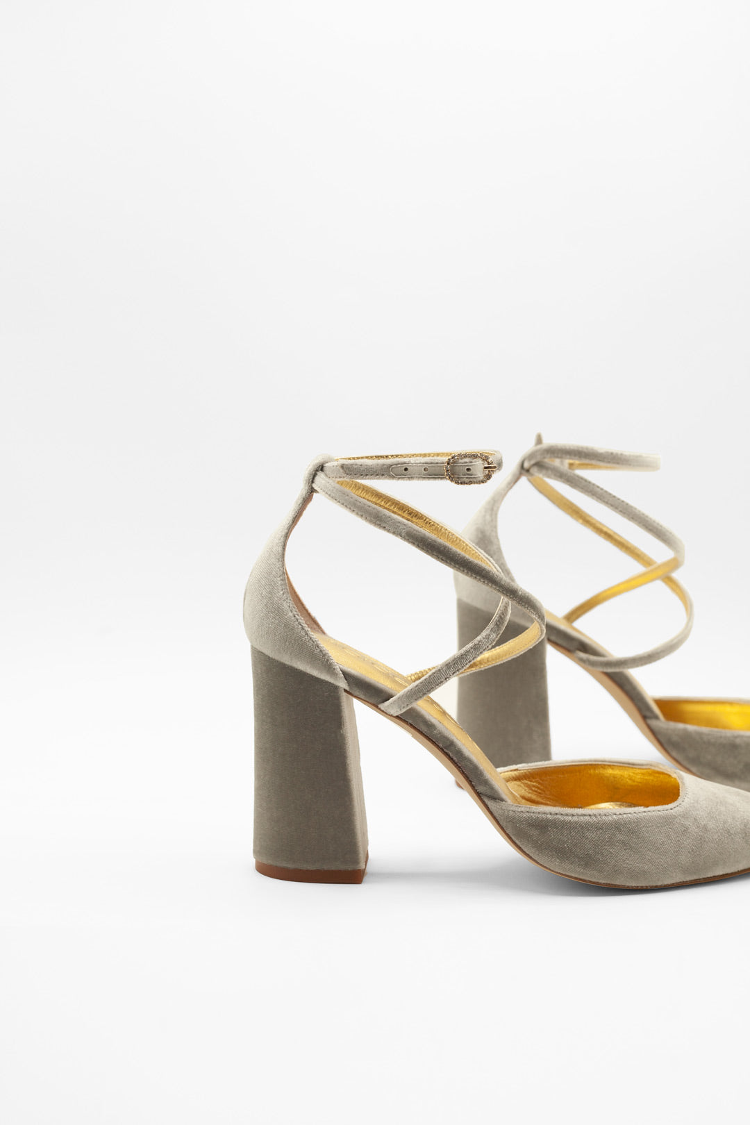 Zapatos de tacón cerrados en punta con tiras en terciopelo en color gris. Su diseño está concebido para estilizar la pierda dando un toque de luz a tu vestido.