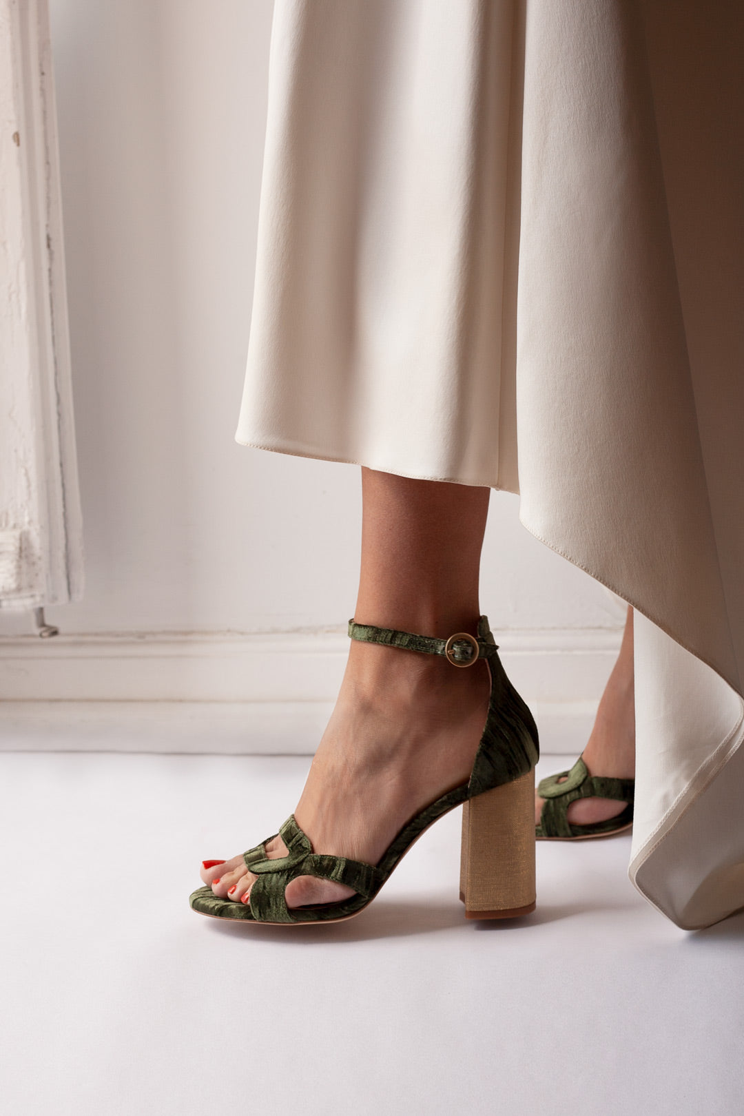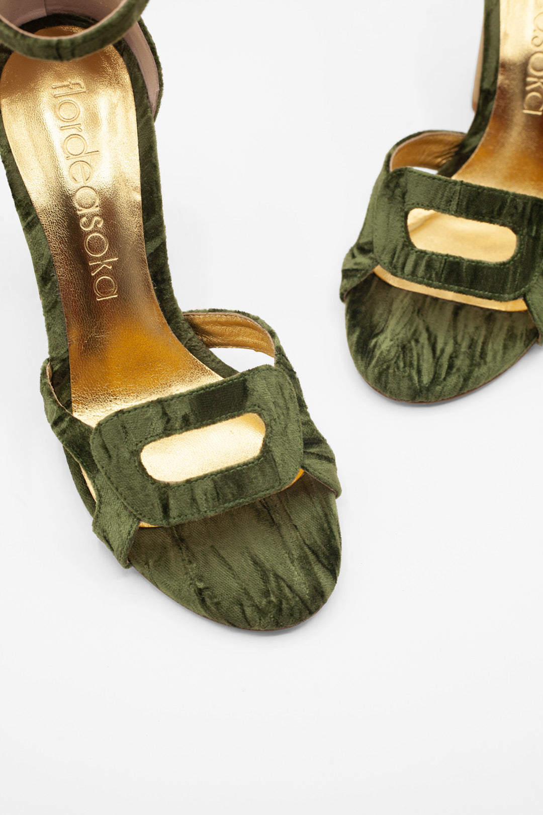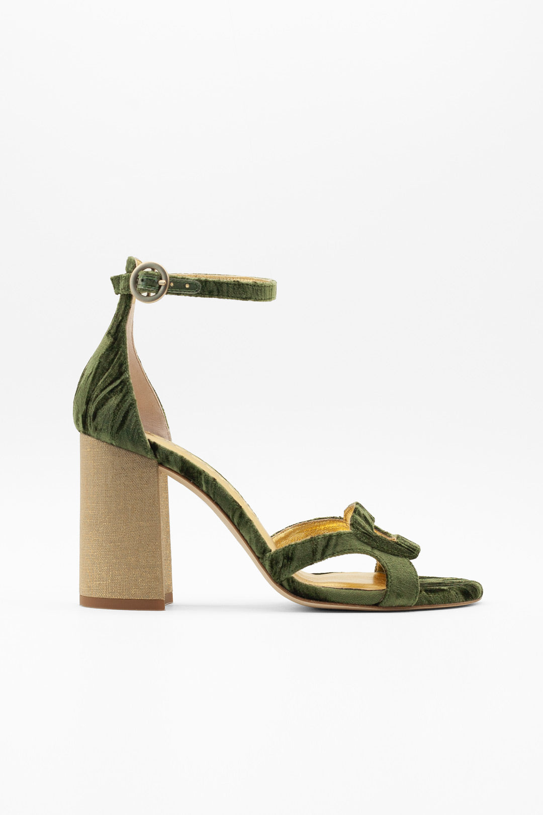 Sandales en velours vert et talon de 9 cm en lin métallisé doré.