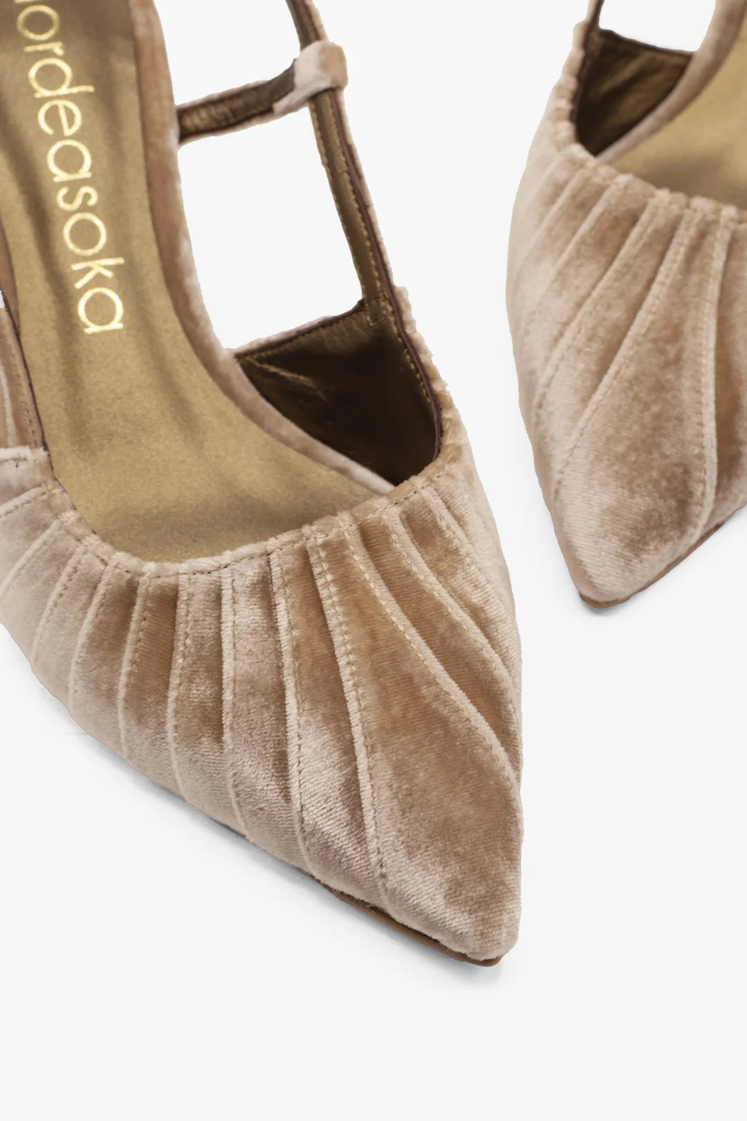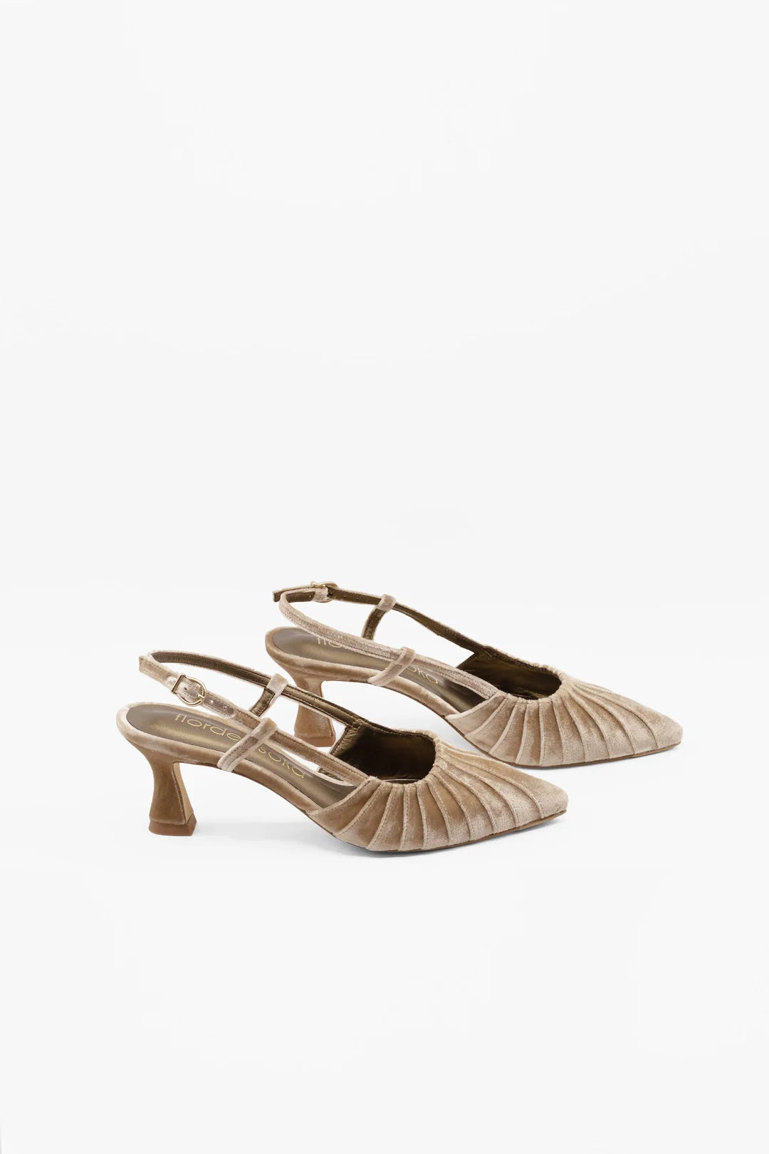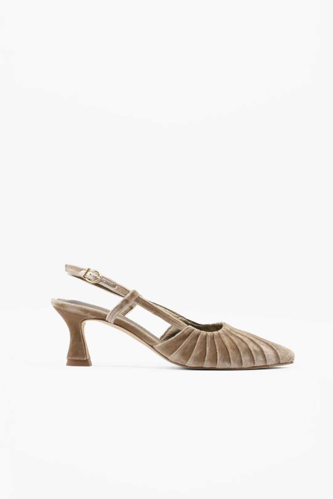 Escarpin à bride arrière fermé en velours noisette, orné de plis floraux originaux. Alliant élégance et polyvalence, il s'adapte à toutes les occasions.