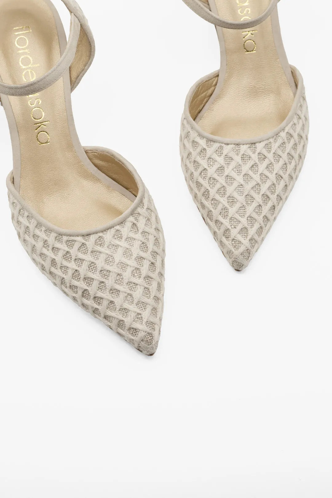 Chaussure fermée à bout pointu en lin rustique avec motif maillée. Une chaussure classique et intemporelle qui s’adapte facilement à différentes palettes et tissus : des ivoires et tons terreux aux pastels doux, dorés ou métallisés.
