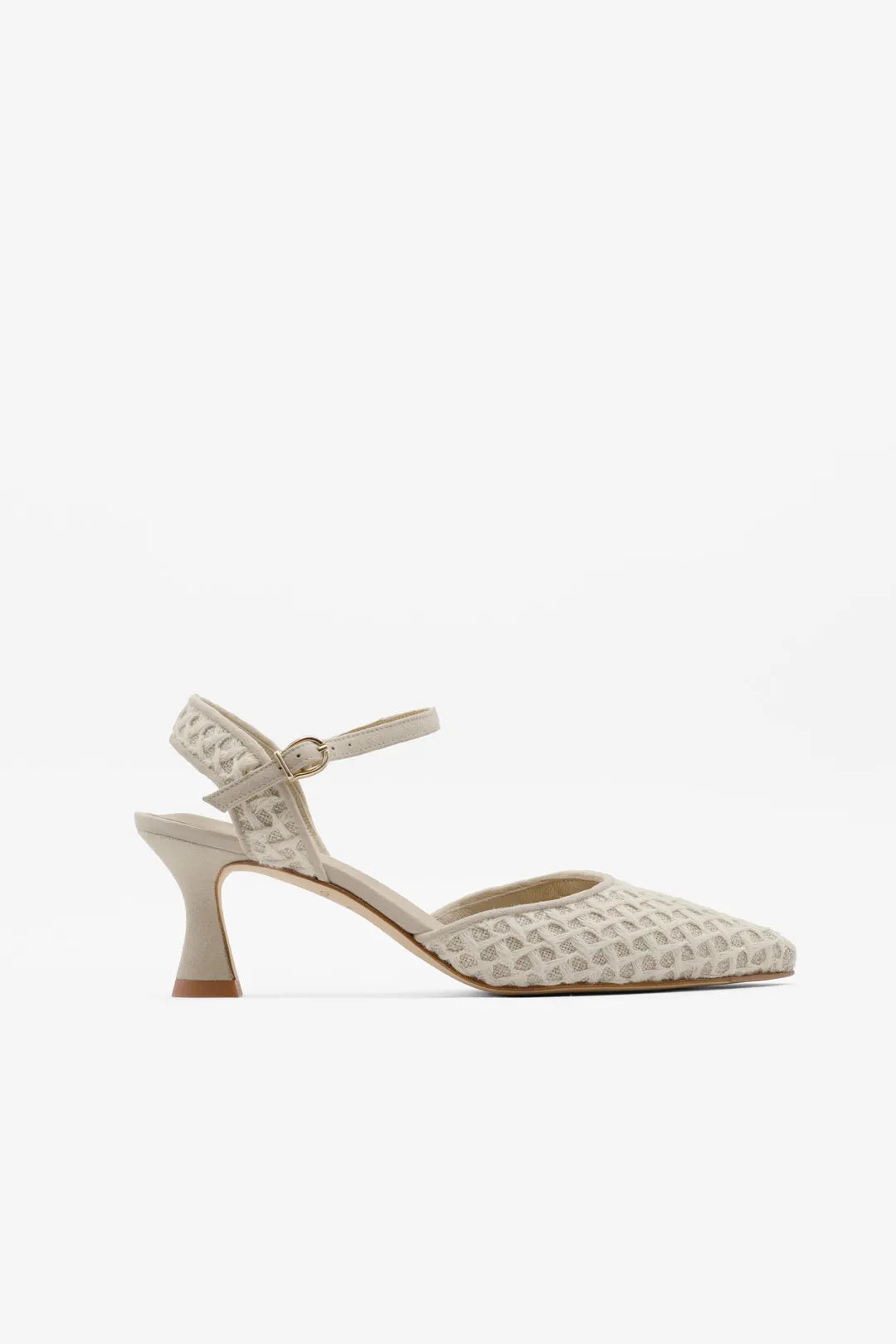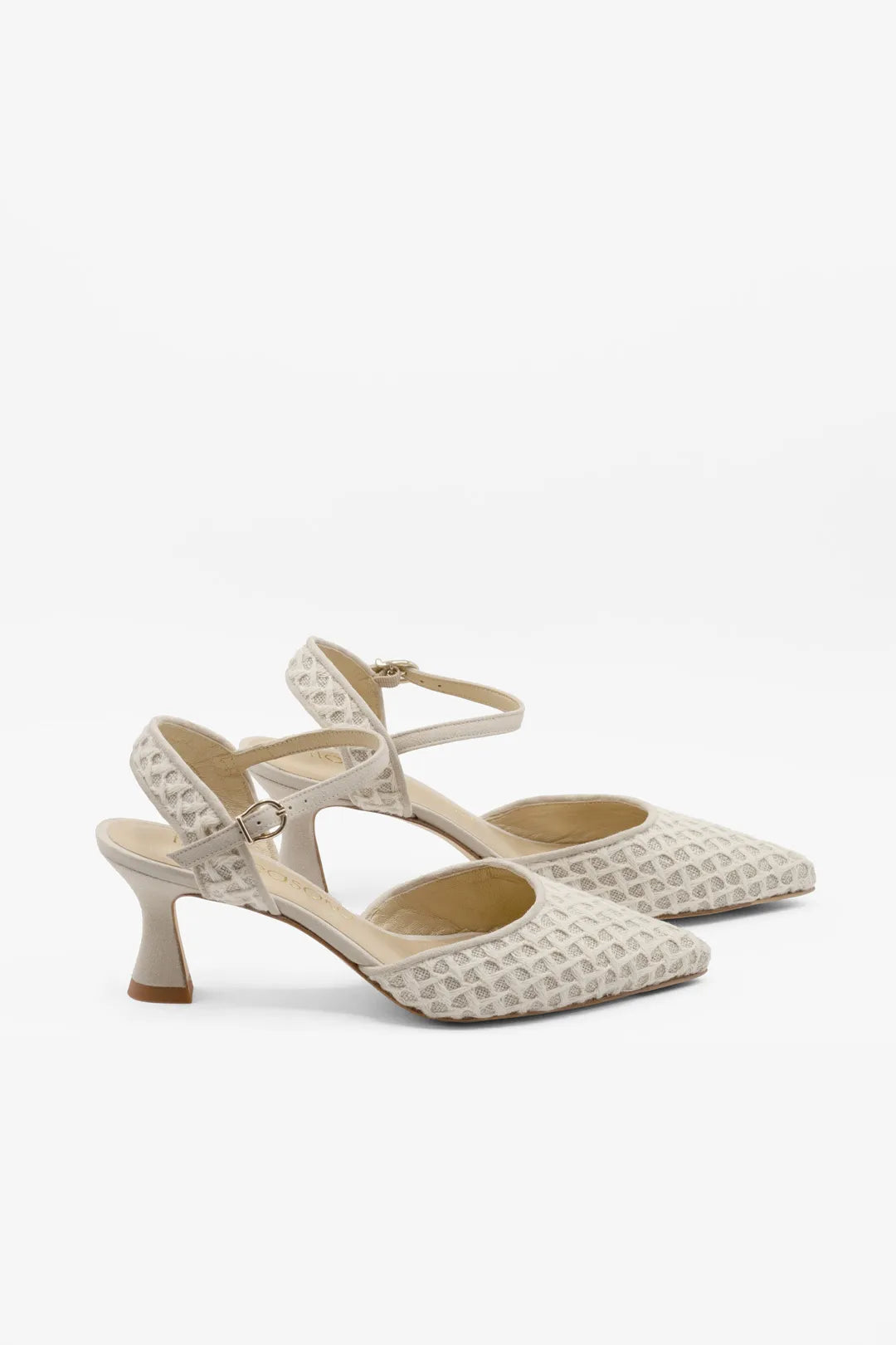 Chaussures en lin beige à bout pointu avec motif en maillée et talon trapèze de 6 cm.