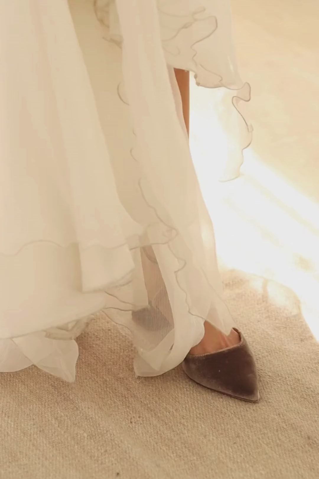 Chaussures en velours de soie marron avec un talon confortable de 5 cm. Le complément parfait pour mariées et invitées.