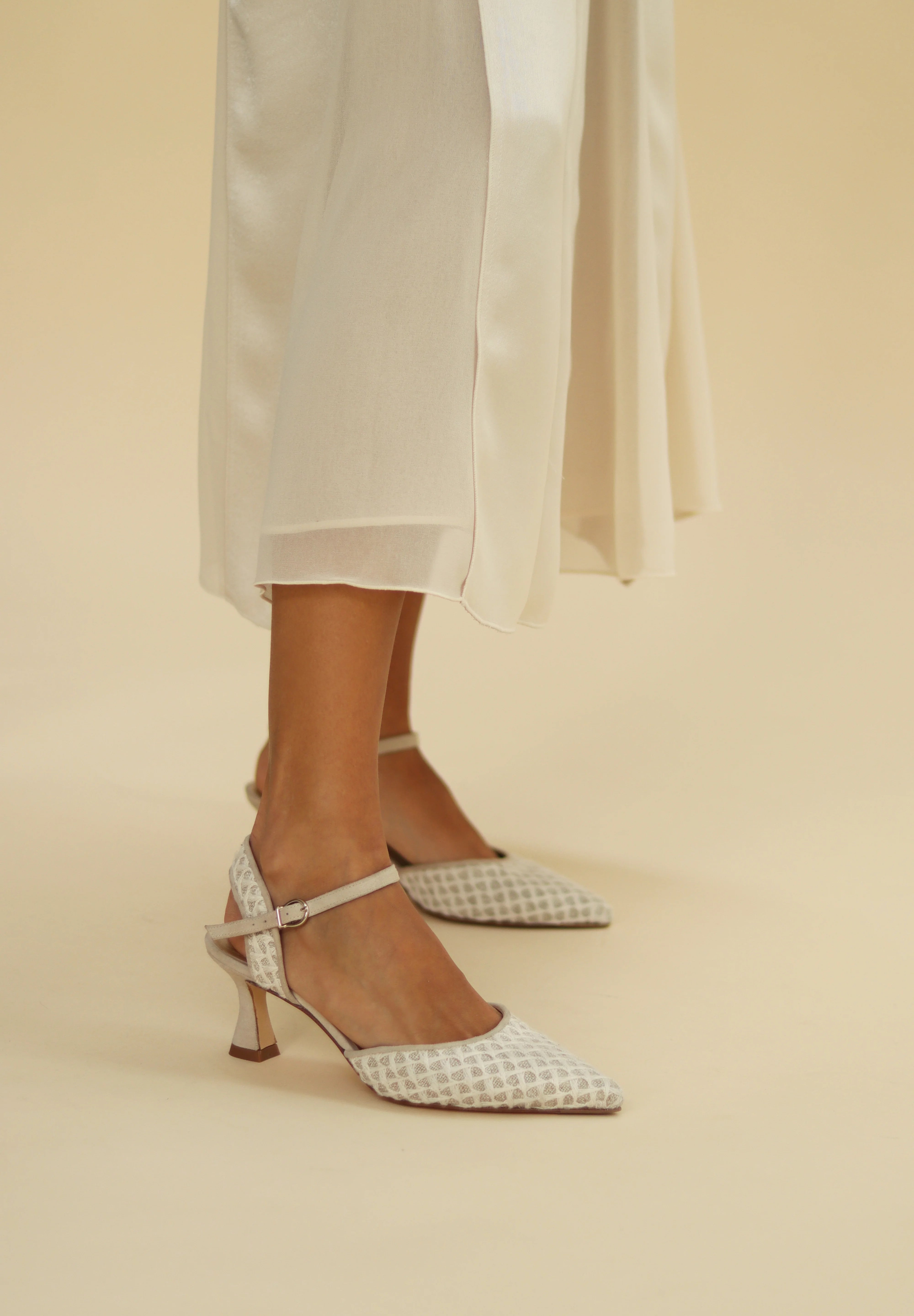 Scarpa chiusa a punta in lino rustico con motivo a intreccio. Una scarpa classica e senza tempo, che si adatta facilmente a diverse palette e tessuti: dagli avori e toni terra ai pastelli delicati, dorati o metallizzati.