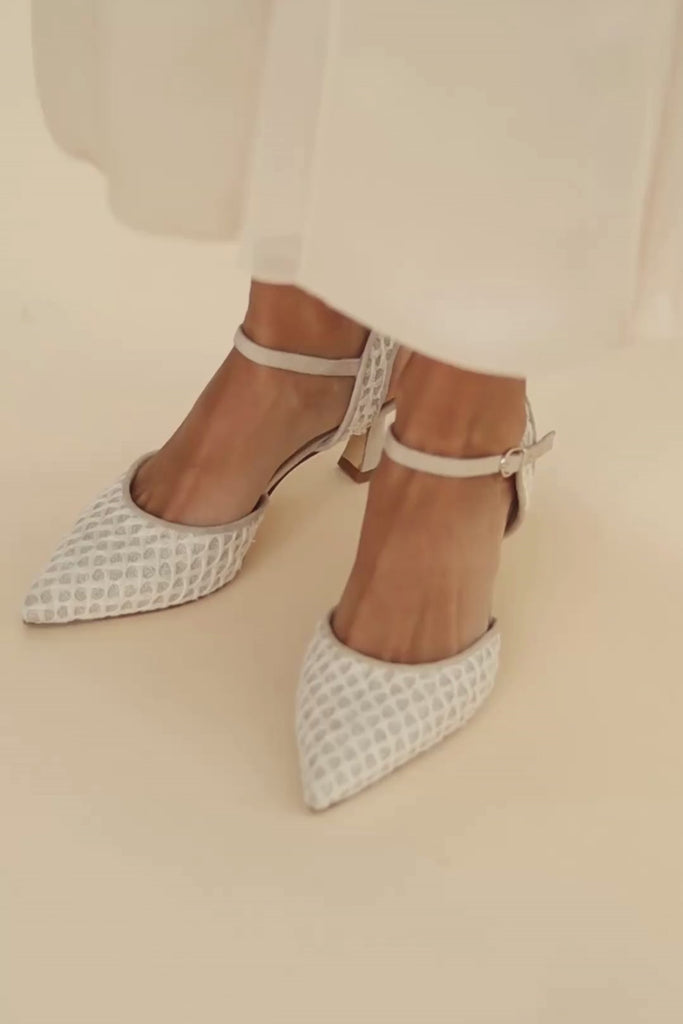 Scarpa chiusa a punta in lino rustico con motivo a intreccio. Una scarpa classica e senza tempo, che si adatta facilmente a diverse palette e tessuti: dagli avori e toni terra ai pastelli delicati, dorati o metallizzati.