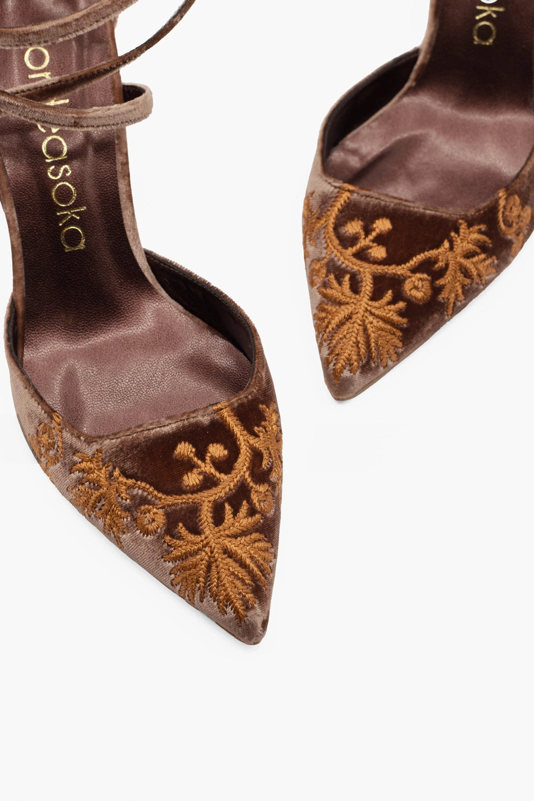 Zapatos de punta en terciopelo con bordados en color garnet y tacón bloque de 9cm.