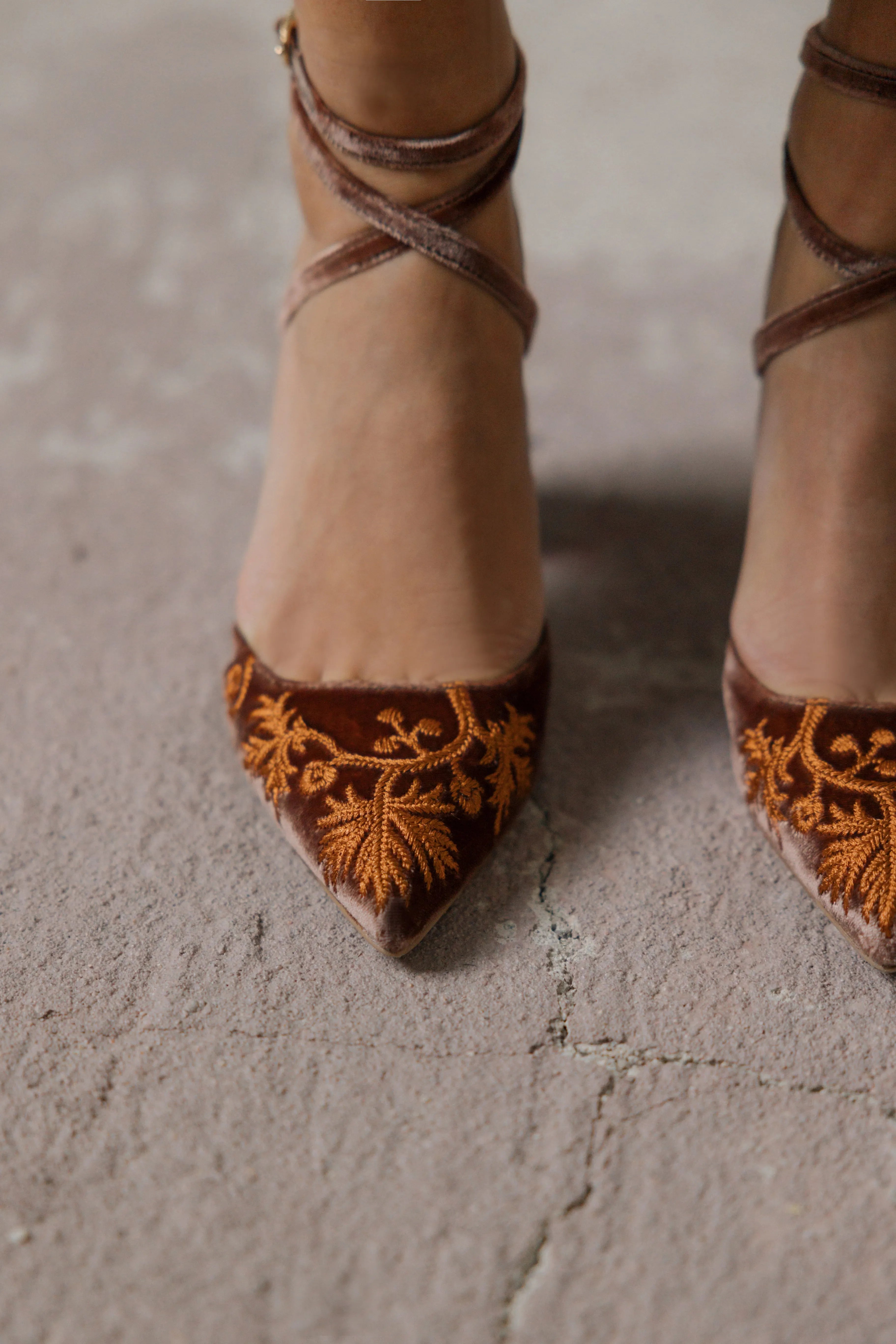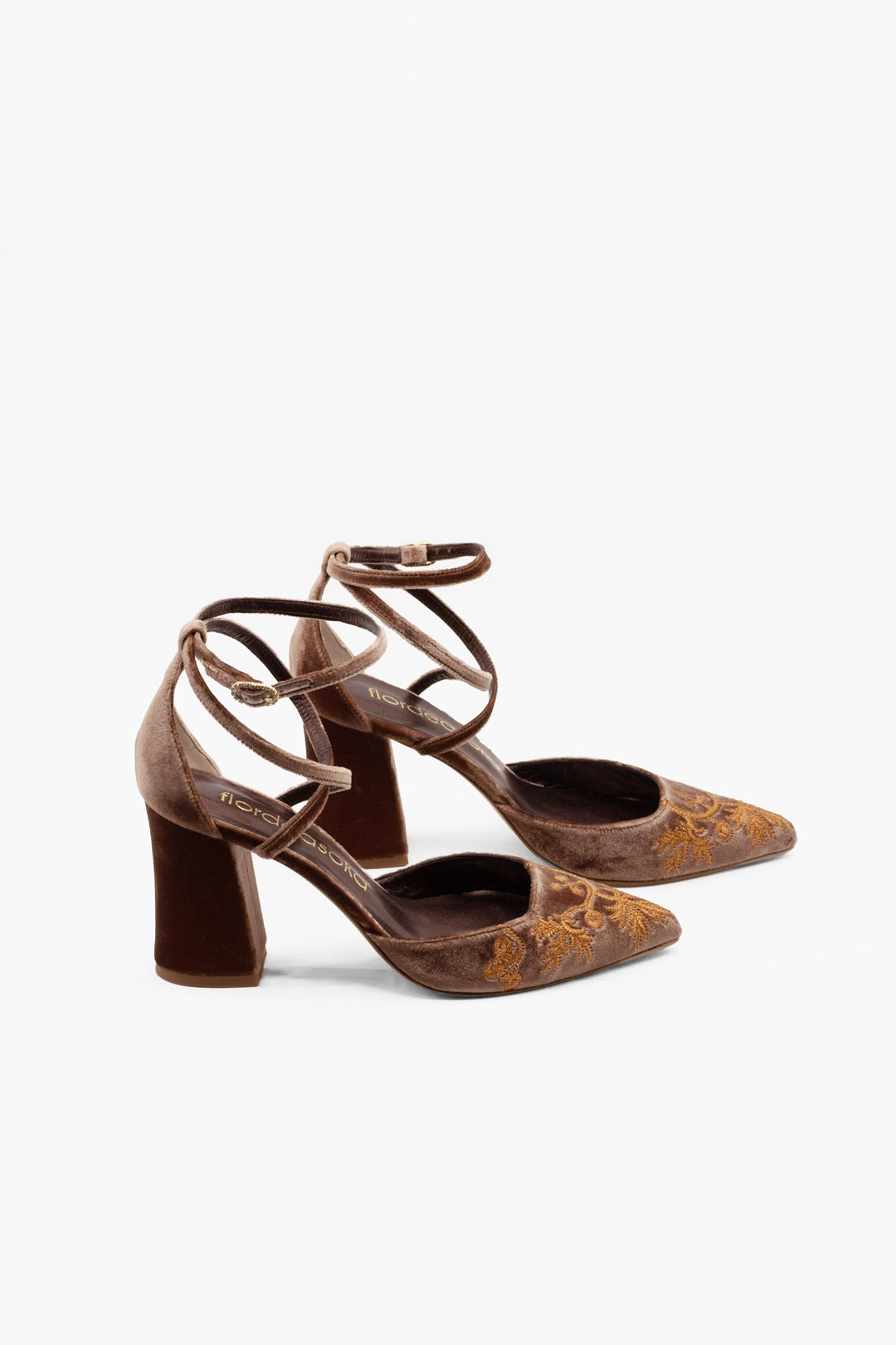 Zapato cerrado de terciopelo en color garnet, con delicados bordados en la punta que aportan un toque único de sofisticación. Su tacón bloque de 9 cm combina comodidad y estabilidad, convirtiéndolo en la elección perfecta para novias, invitadas o cualquier ocasión especial. Inspirados en los bordados que se impulsaron en la corte Española a finales del siglo XV.